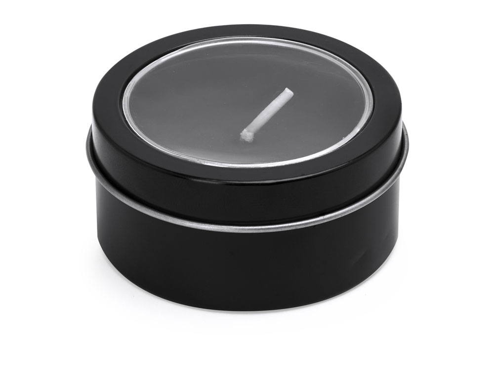 Ароматическая свеча с запахом ванили в металлическом круглом подсвечнике с крышкой с прозрачным окошком. Цвет свечи в тон подсвечника. белый фитиль