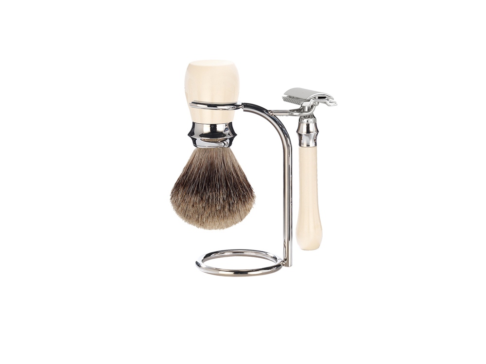 Набор из коллекции GAUDI с помазком Tasso Tec / Best Badger из натурального барсучьего волоса, классический станок для двух лезвий. Материал - смола цвета слоновой кости