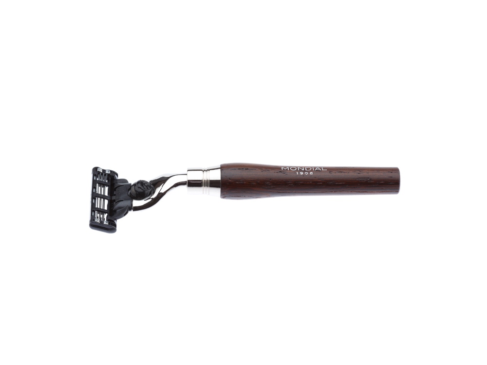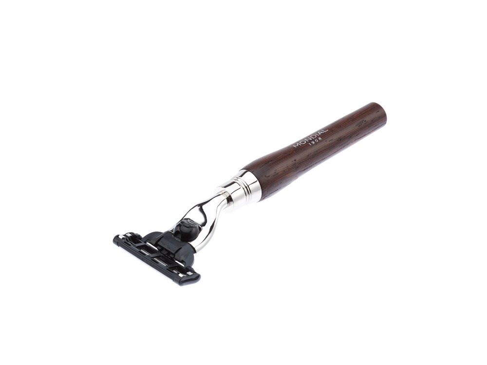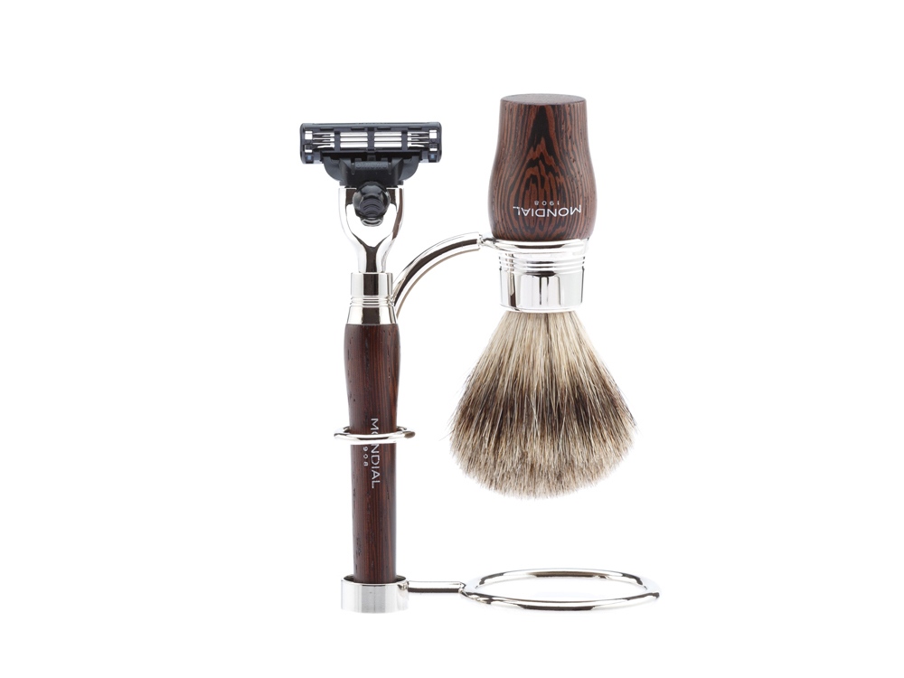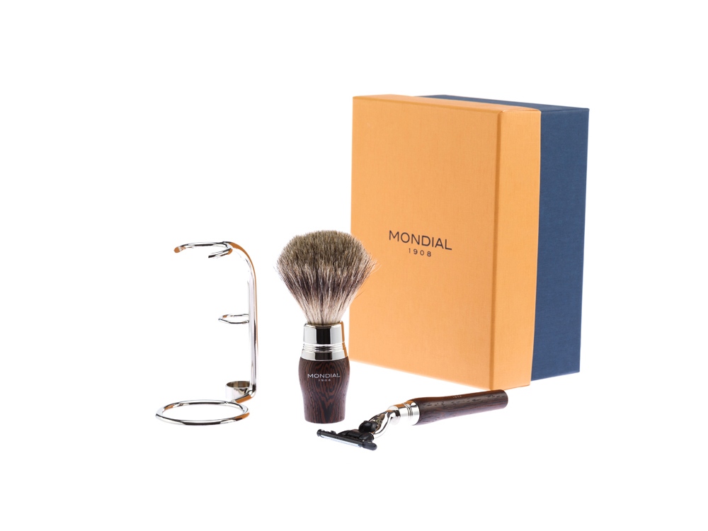 Ассортимент бритвенных аксессуаров MONDIAL является эталоном для всех видов бритья. Только лучшие материалы обретают форму в опытных руках итальянских мастеров. Бритвенный набор из лимитированной коллекции MONDIAL разработан лучшими итальянскими дизайнерами. В наборе идеально сочетаются искусно обработанная древесина венге и великолепный ворс барсука. Минималистичный, но элегантный дизайн бритвенного набора – уникальный в своем роде современный элемент роскоши, это возможность выйти за рамки моды для создания аутентичного итальянского стиля вне времени. Бритвенный набор MONDIAL • бритвенный станок, совместимый с кассетами Gillette MACH3 (одна кассета в комплекте); • помазок с барсучьим ворсом категории Best Badger, диаметр узла - 20 мм (размер M); • подставка из никелированной латуни Помазок Тип ворса: Натуральный барсучий ворс категории Best Badger Диаметр узла: 20 мм (размер M) Материал рукояти: дерево Венге, никелированная латунь Размеры: высота помазка - 118 мм, высота рукояти - 60 мм, диаметр основания - 32 мм Вес: 80 гр. Станок Тип лезвия: Gillette MACH3 Материал рукояти: дерево Венге, никелированная латунь Размеры: высота станка с лезвием - 137 мм Вес: 35 гр. Подставка подставка для бритвенного станка и помазка изготовлена из никелированной латуни