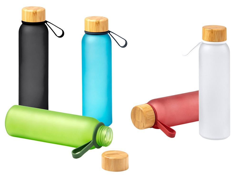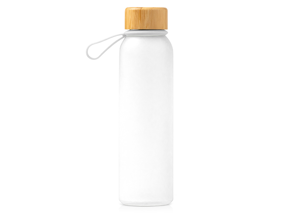 Полупрозрачная бутылка из переработанного стекла. Бамбуковая крышка с держателем. Объём: 500 мл. Поставляется в индивидуальной коробке.