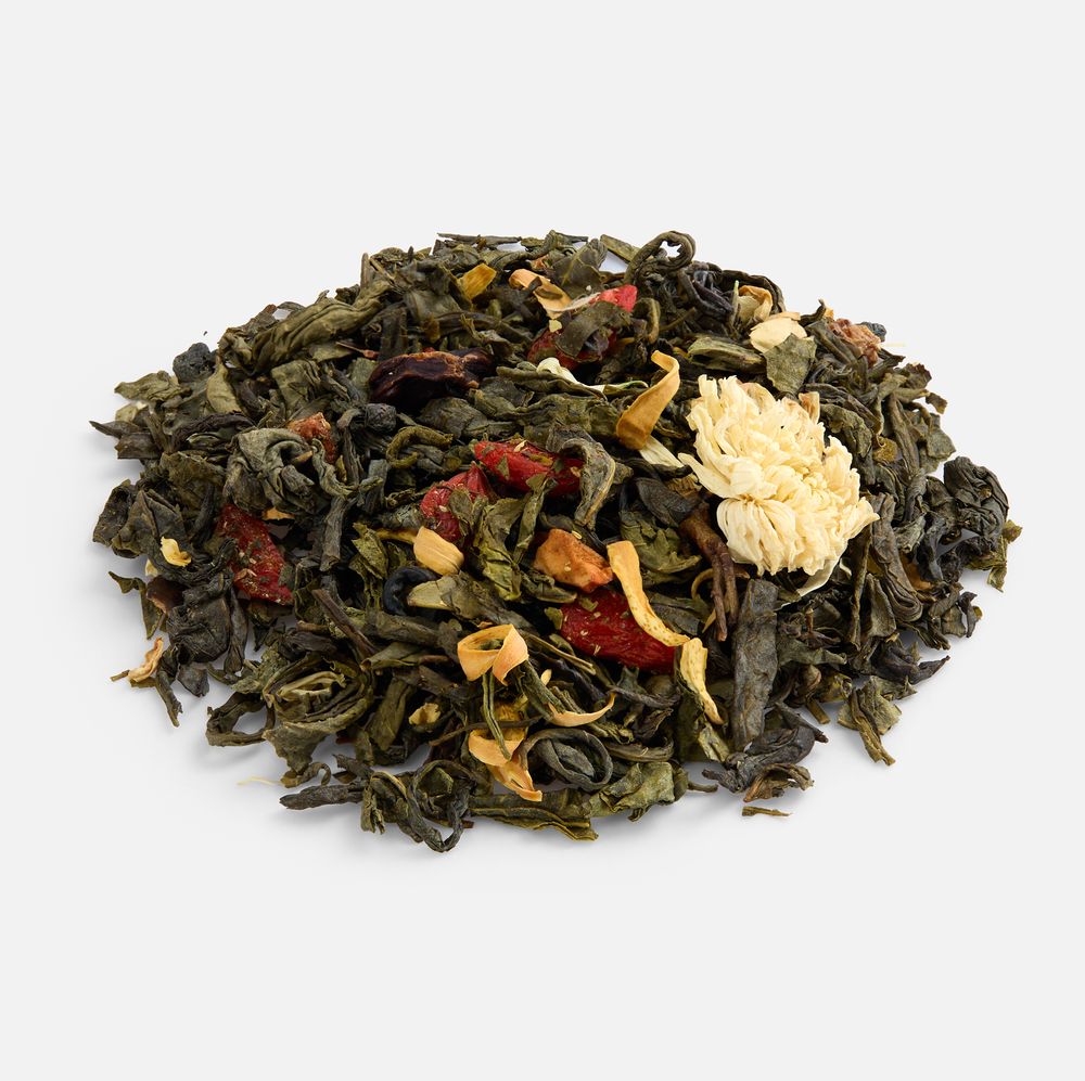 Ягоды годжи и сублимированная клубника добавляют витаминную свежесть, а цветки хризантемы и апельсинового дерева дарят тонкий цветочный аромат.
