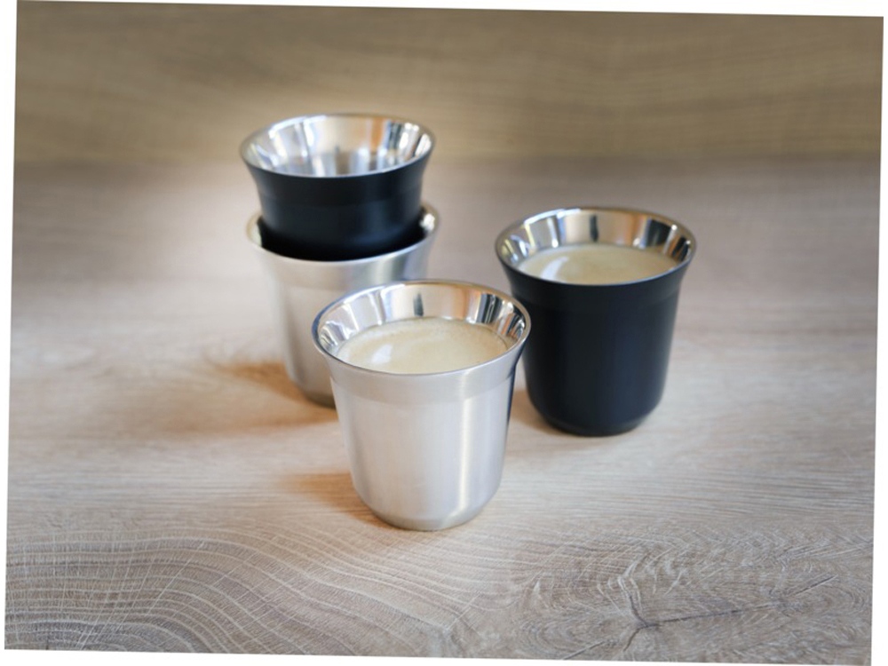 Набор из 2 чашек для эспрессо из нержавеющей стали, сертифицированной RCS, с двойными стенками. Объем — 80 мл. Поставляется в подарочной коробке из переработанного картона. 91% RCS certified recycled stainless steel.