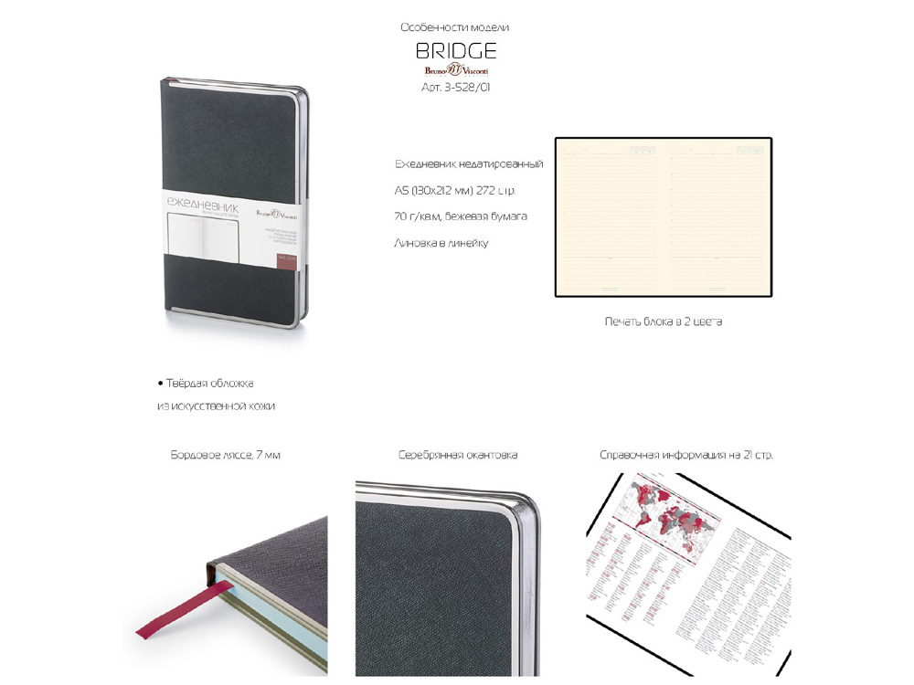 Недатированный ежедневник Bridge от бренда Bruno Visconti - это качественный корпоративный подарок по выгодной цене, произведенный специально под персонализацию. Представлен в универсальном формате А5. Ежедневник Bridge - воплощение классики, актуальной во все времена. Тисненый переплетный материал под кожу смотрится благородно и элегантно в дуэте со светлым металлическим кантом серебристого цвета. Его дополняет тонированный обрез блока. Солидный ежедневник Bridge в долговечном переплете – выбор деловых людей, ценящих проверенное качество. В ежедневнике Bridge есть полезная справочная информация на русском языке, а также 272 страницы для записи идей, мыслей и составления рабочих планов. День недели указан на английском языке. Для изготовления страниц используется качественный офсет, тонированного в кремовый цвет (70 г/кв м), который производится в Японии и подходит для всех видов чернил. Модели Bridge – неотъемлемые атрибуты офисной жизни. Они смотрится также внушительно, как и Тауэрский мост – символ Лондона. Ежедневники от бренда Bruno Visconti можно персонализировать с помощью всех видов тиснения обложки. Наши ежедневники помогут быть успешным и эффективным в карьере и повседневной жизни!