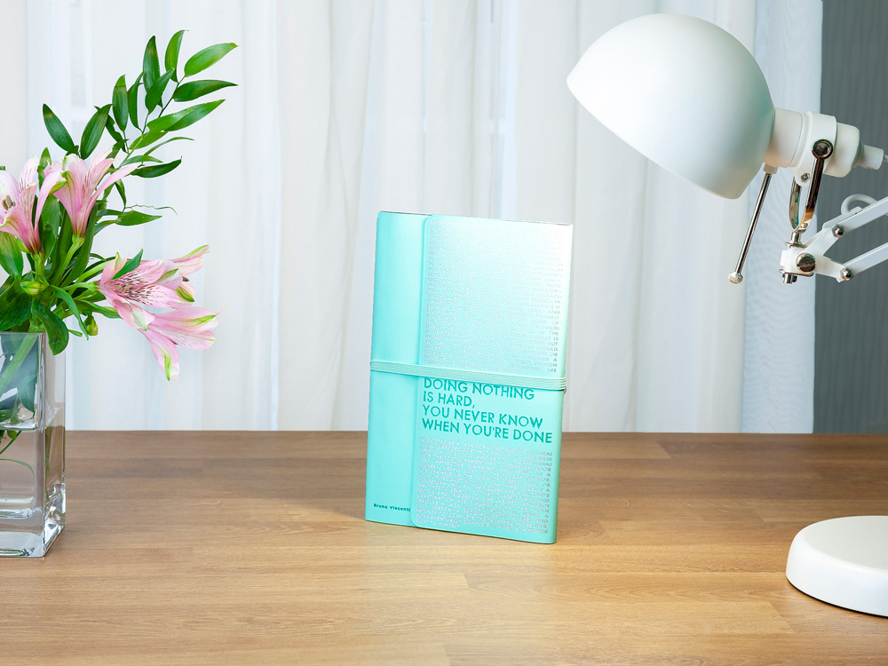 Так трудно ничего не делать, ведь совершенно непонятно, когда ты закончишь! Лаконичный слоган мотивирует к активным действиям. Планируй и завершай! Вот что кроется в элегантной надписи, выполненной золотым тиснением! А Flex обложка напоминает Будь гибким! Великолепный недатированный ежедневник Bilbao черно-синего цвета с тиснением фольгой. Бежевая бумага 65 г/м, широкая горизонтальная фиксирующая резинка. Гибкая обложка с покрытием Soft-touch. Особенность этого ежедневника - часть обложки внахлест может использоваться как закладка. Ежедневник упакован в картонный полукороб и термопленку.