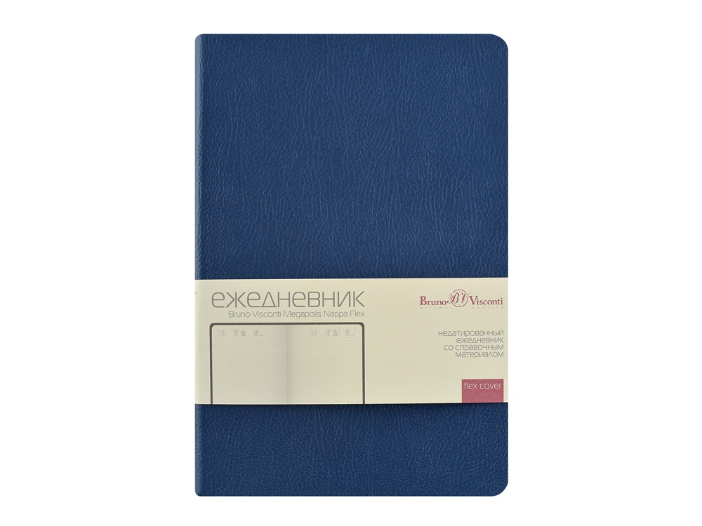 Обложка недатированного ежедневника Megapolis Nappa Flex ТМ Bruno Visconti произведена из искусственной кожи без применения переплетного картона, благодаря чему он легче и изящнее классических. Его можно свернуть в трубочку, обложка и блок не пострадают. При этом, для ежедневника формата А5 доступны те же опции, что и для любых других ежедневников — окрашенный обрез, крупнозернистая фактура искусственной кожи обложки, двойное ляссе 7 мм. Блок изготовлен из бежевой бумаги плотностью 70 г/м2 и помимо раздела для планирования рабочего времени включает в себя 12 страниц справочной информации.