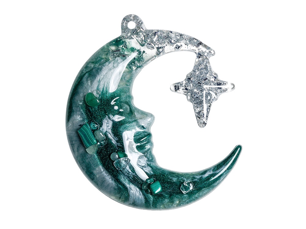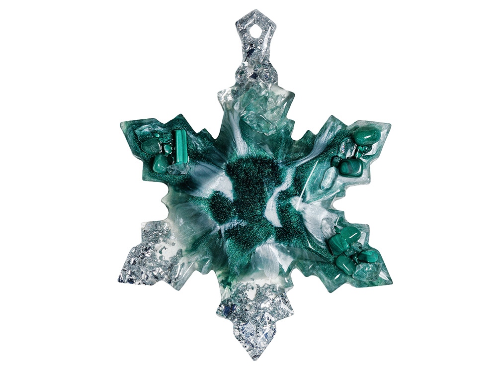 Набор из 2-х елочных игрушек: в форме месяца и снежинки. Игрушки выполнены из ювелирной эпоксидной смолы и украшены галтовкой из натуральных минералов. Игрушки бережно упакованы в картонную коробку с внутренним вкладышем, который надежно фиксирует их внутри. Для вашего удобства к каждой игрушке прилагается элегантная ленточка, с помощью которой вы легко сможете подвесить их на ёлку.