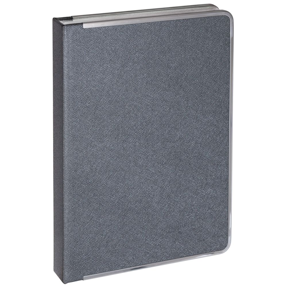 Ежедневник с твердой обложкой и серебристым обрезом, выполнен из материала Saffian, темно-серый, дополнен серым ляссе и металлическими рамками.