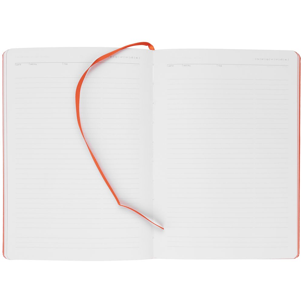 Ежедневник с твердой обложкой. Выполнен из материала Latte, оранжевый, дополнен ляссе в цвет обложки.