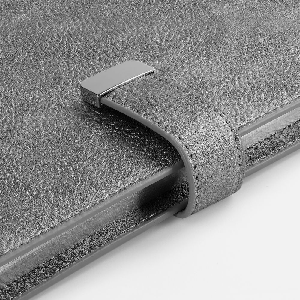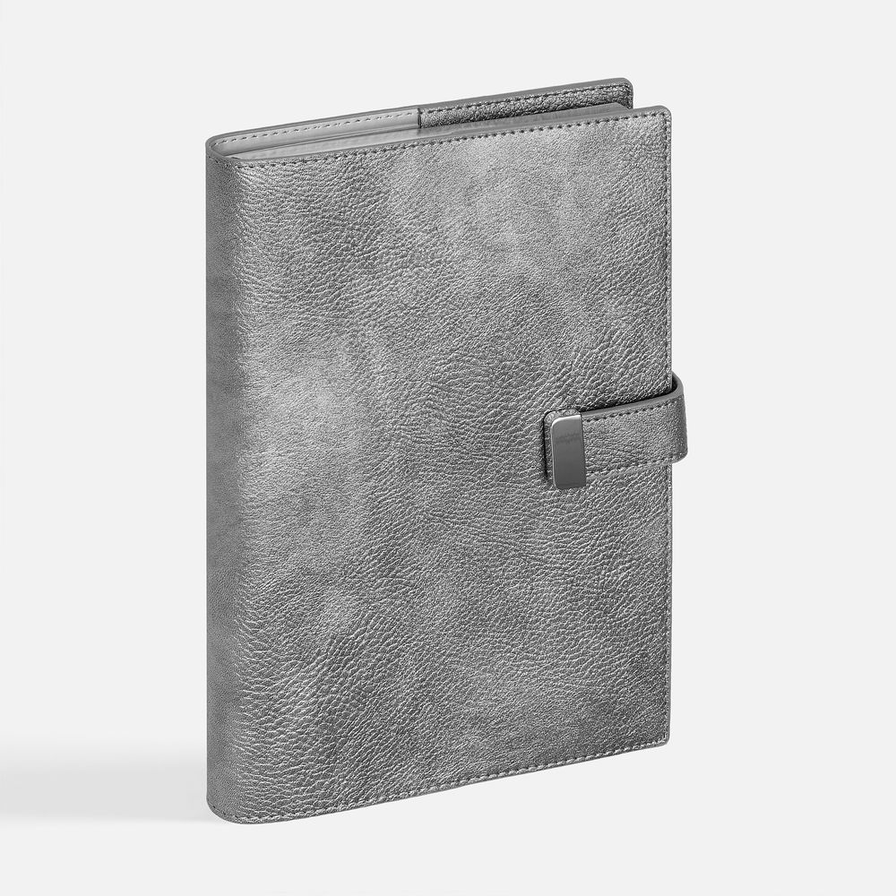 Ежедневник в мягком переплете со съёмная обложкой, дополнен застёжкой-хлястиком  с металлическим шильдом на кнопке, двойным ляссе и капталом.