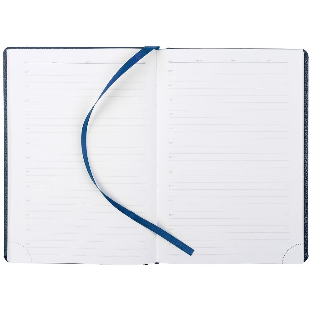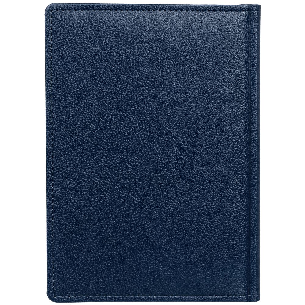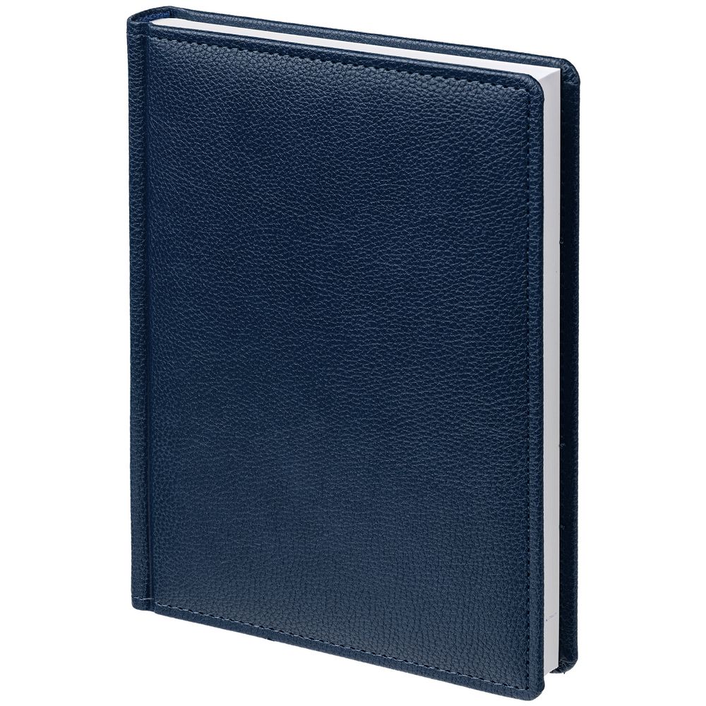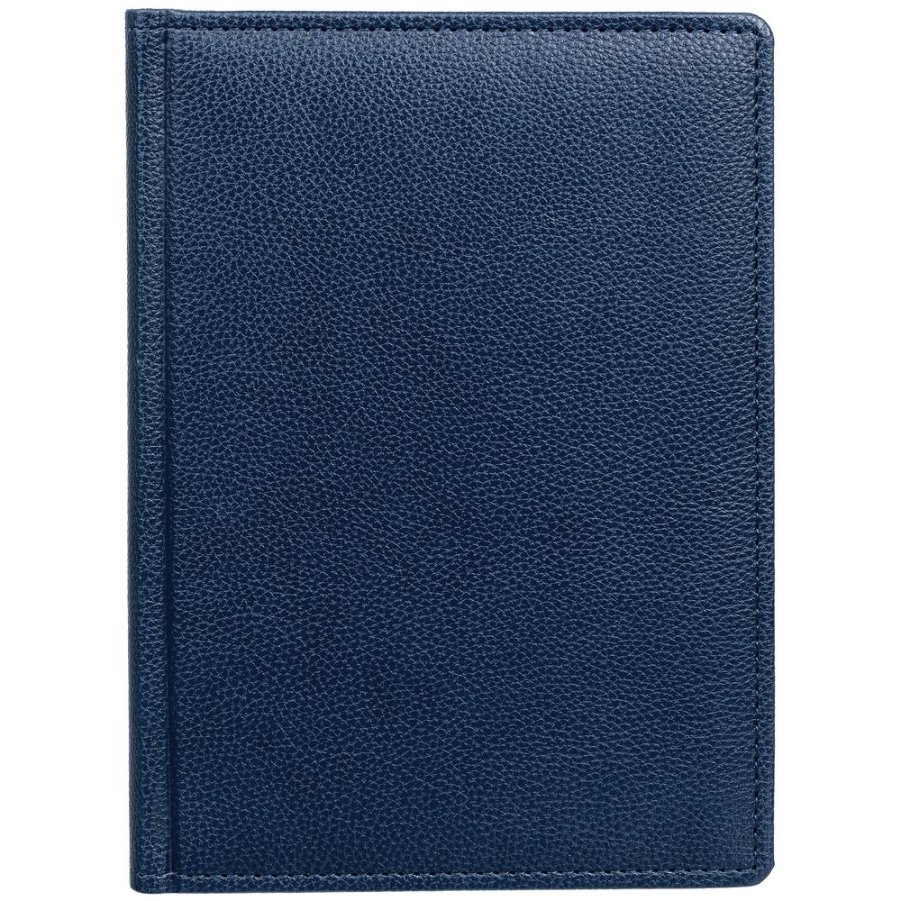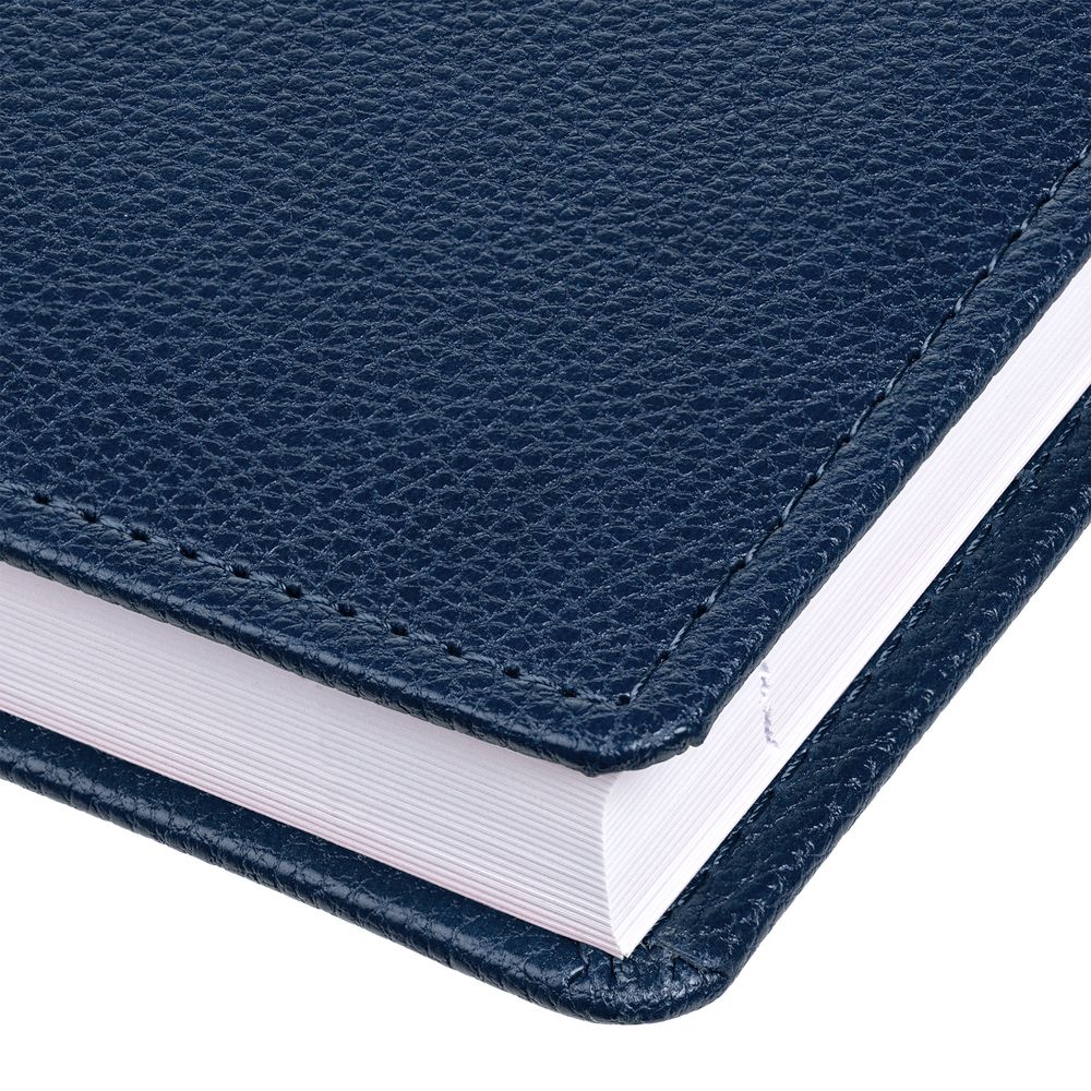 Ежедневник в твердой обложке c поролоном, выполнен из материала La Fite, темно-синий ХХ, дополнен ляссе синего цвета и прошивкой по периметру обложки.