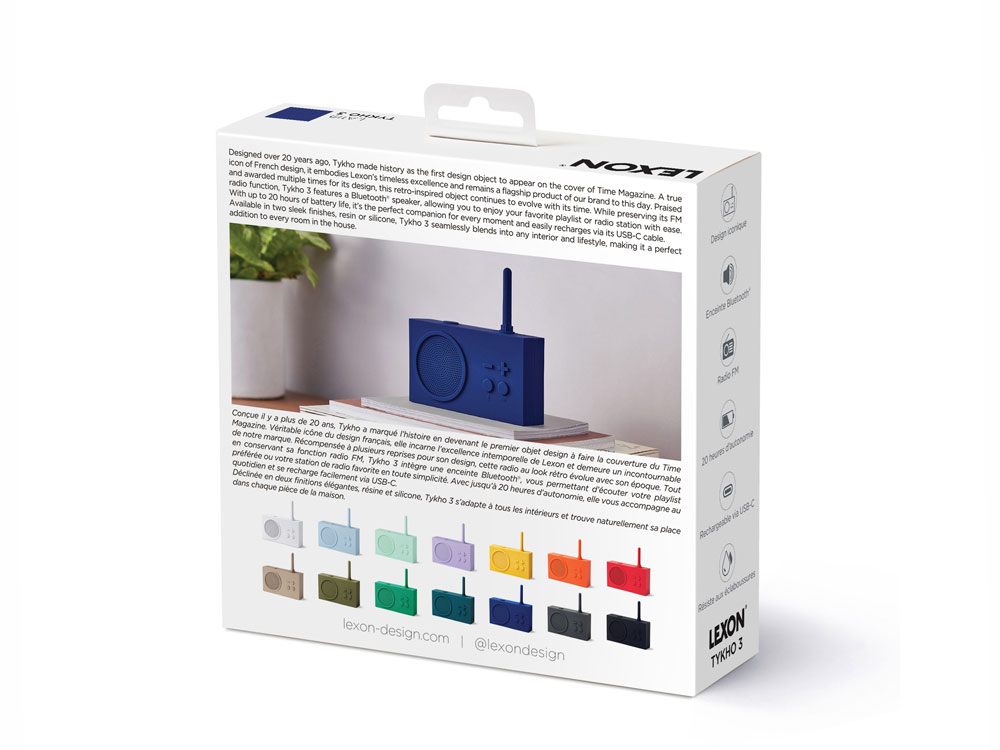 Созданный более 20 лет назад, Tykho вошёл в историю как первый дизайнерский объект, появившийся на обложке престижного журнала Time. Будучи символом французского дизайна, он воплощает непреходящее совершенство Lexon и по сей день остаётся культовым продуктом. Этот культовый радиоприёмник в ретро-стиле, многократно отмеченный наградами за свой дизайн, развивается в ногу со временем. Сохраняя традиционную функциональность FM-радио, Tykho теперь оснащён Bluetooth®-динамиком, что делает его неотъемлемой частью повседневной жизни. - Bluetooth®-динамик с FM-радио - Защита от брызг - Диапазон частот: FM 88 108 МГц - Радиус действия Bluetooth®: 10 м - Срок службы батареи: 20 ч - Время зарядки: 4 ч - Заряжается через USB-C - кабель в комплекте