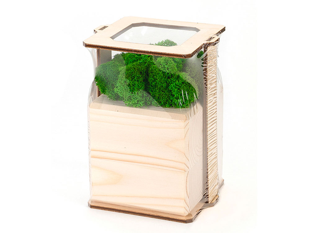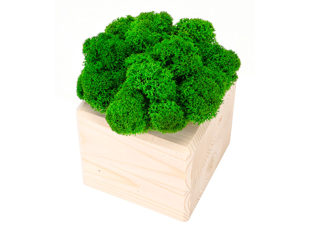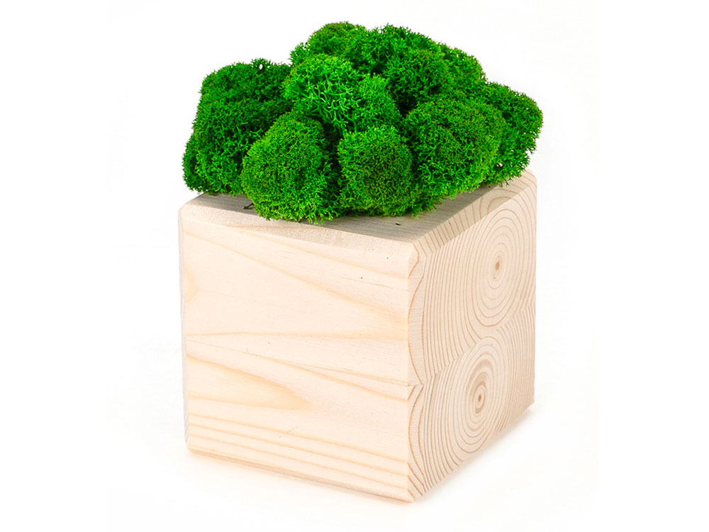 Композиция со мхом создана для любителей официального стиля. Зелень и дерево в интерьере - популярный тренд в области украшения дома или офиса. Специальная обработка мха позволяет не ухаживать за ним до 7 лет. Композиция не требует освещения и полива, успокаивает и дарит положительные эмоции. Изделие состоит из стабилизированного мха ягеля, деревянного куба и деревянного упаковочного каркаса. Отталкивает пыль и придает интерьеру индивидуальность. Размер изделия 8х8х13 см.