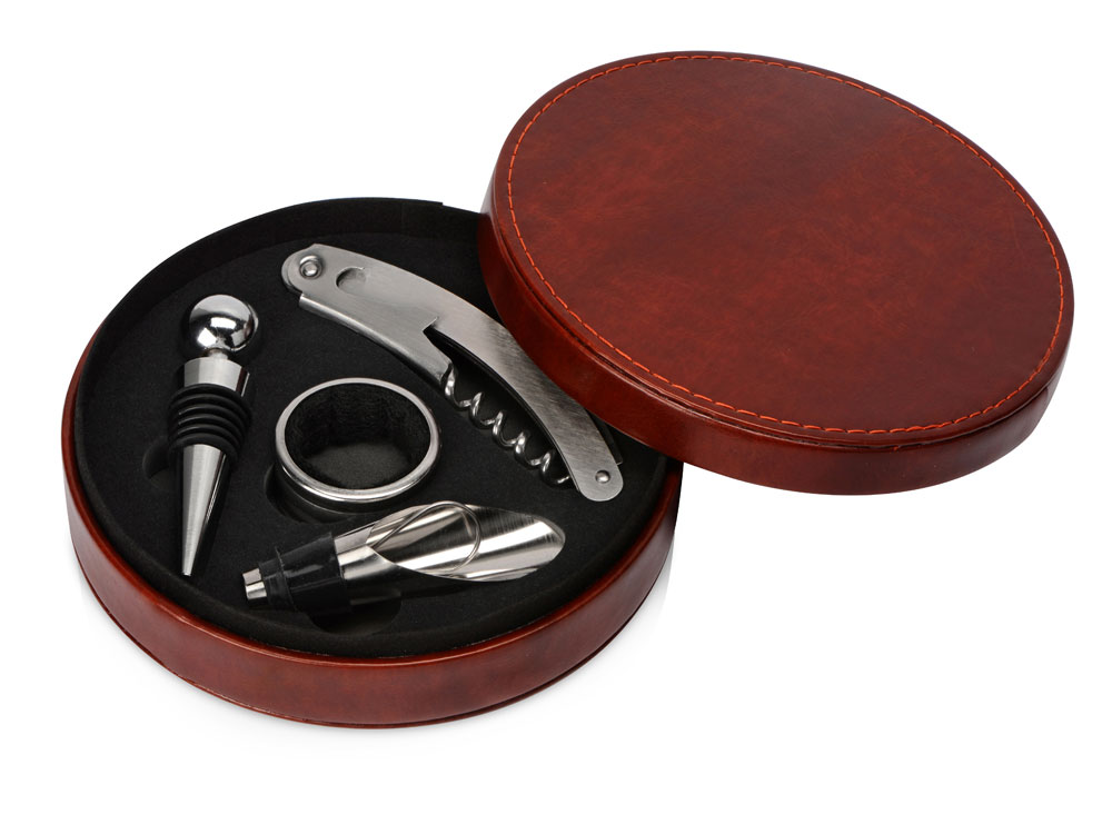 Набор винных аксессуаров состоит из воронки-аэратора, пробки, каплеуловителя и штопора. Металлические детали выполнены из нержавеющей стали, устойчивой к коррозии, также использованы силиконовая резина и АБС-пластик, абсолютно безопасный для человека. Винные принадлежности разложены в красивом круглом футляре на бархатистом вырубленном ложементе, где для каждого инструмента предусмотрено свое место. Снаружи набор обтянут искусственной кожей, точно такой же по текстуре и цвету, что и другие изделия серии Fabrizio, что позволяет составлять с ними гармоничные комплекты. - воронка-аэратор позволяет насытить вино кислородом, чтобы раскрыть вкус и аромат напитка - каплеуловитель защитит вас от винных подтеков - пробка с силиконовым уплотнителем сохранит вино свежим - нержавеющая сталь обеспечивает изделиям долгую жизнь - компактная коробка - легко собирать наборы с другими изделиями серии Fabrizio благодаря общему стилю