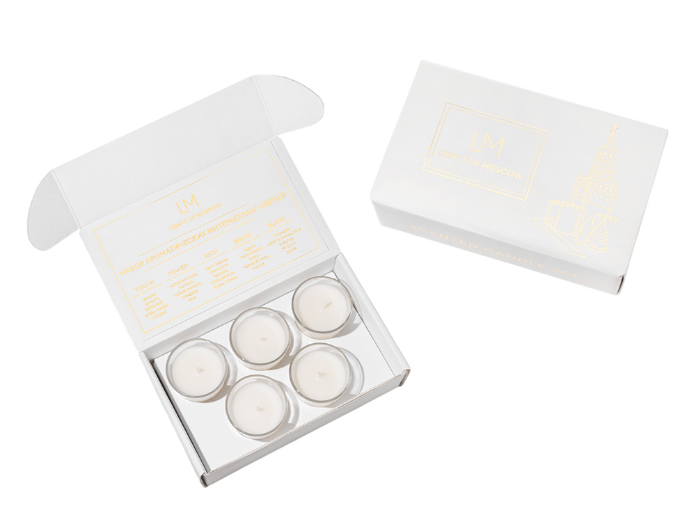 Подарочный набор ароматических свечей - это не только прекрасный, необычный подарок, но и отличный способ познакомиться брендом Lights of Moscow и его эксклюзивными ароматами. Scented candle set состоит из 5 ароматов со своей особенной историей, ассоциацией. Touch Притягательный и соблазнительный аромат во главе со спелой вишней, в которой контрастируют сладкие и терпкие, яркие и таинственные ноты. Красная и чарующая она пробуждает неутолимое желание и будоражит фантазию, завершая композицию незаметным шлейфом чувственных нот: бобами тонка, бергамота, ванили и сандалового дерева. Power Энергичная, но в то же время утонченная композиция, напоминающая морские брызги и дуновение ветра. Глубокие, акватические ноты постепенно раскрываются в тандеме с зелёным яблоком и белым мускусом. Бодрящий и свежий аромат завершается оттенками ландыша и мха, подчёркивая прохладу и романтику всей пирамиды нот. Secret Чувственная и романтическая орхидея - это цветок любви и красоты, олицетворяющий великолепие и совершенство. Женственная композиция дополнена оттенками цветка апельсина, который подчеркивает фруктовые акценты, а дополнение в качестве пленительных нот фиалки, мускуса и дыни придают особенную глубину композиции. Rich Это аромат роскоши, атмосфера светского мероприятия, проходящего в дорогом зале, где собрались леди и джентельмены. Листья табака имеют пряный и в тоже время свежий аромат, он прекрасно дружит с ванилью, усложняя композицию, делая её более дорогой и утонченной. В то время как сухофрукты и бобы тонка добавляют интригующей ноты аромату. Black Дымный и загадочный аромат с яркими нотами смолы и ладана ассоциируется с уверенностью и элегантностью. Восточно-древесная композиция дополнена восхитительным, интригующим шлейфом пало санто, кожи и чёрного перца. Комплектность: - Подарочная коробка с ложементом и брендированной лентой - 1 шт. - Свечи 5 шт.*50 мл. - Открытка - 1 шт. Условия хранения: — Свечи, аромасаше, аромадиффузоры, SPA-наборы следует хранить при температуре +18…+24 °C, вдали от источников тепла, сквозняков и прямых солнечных лучей. — Рекомендуемая влажность — не более 50%. — Избегайте длительного воздействия яркого света.