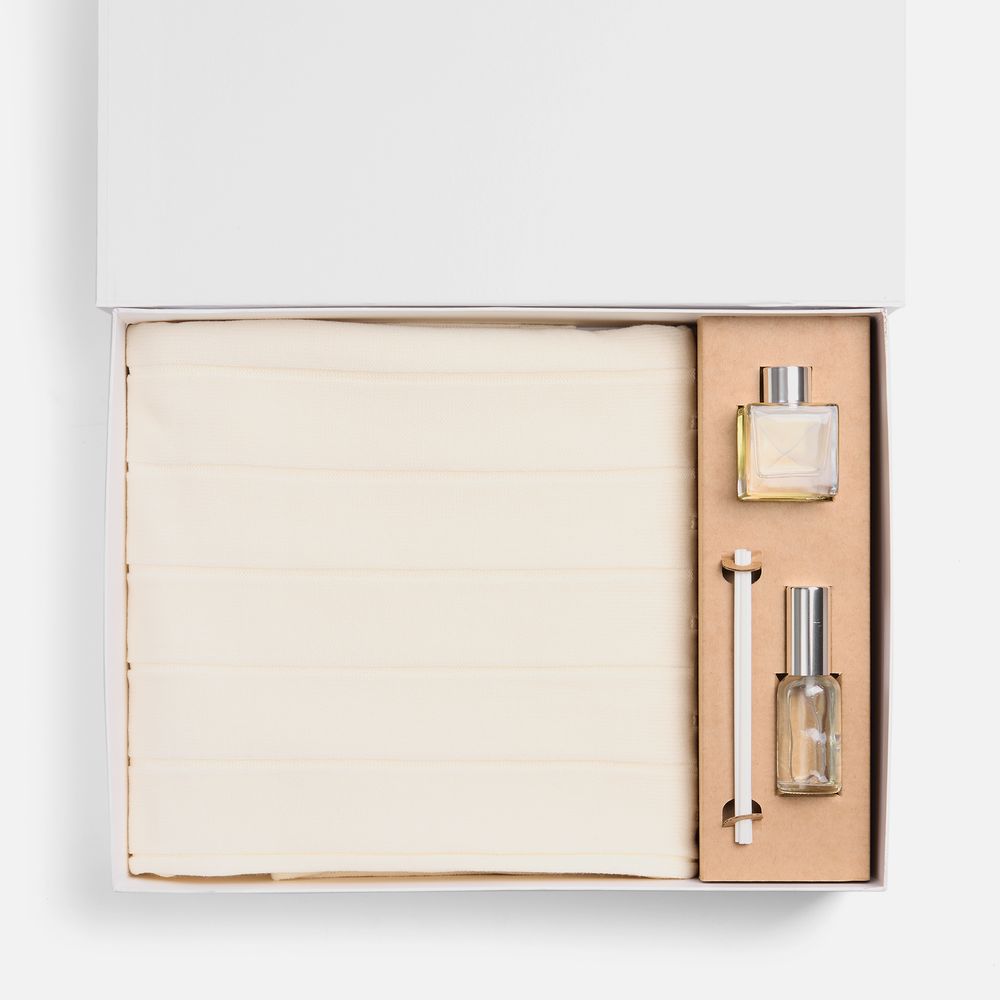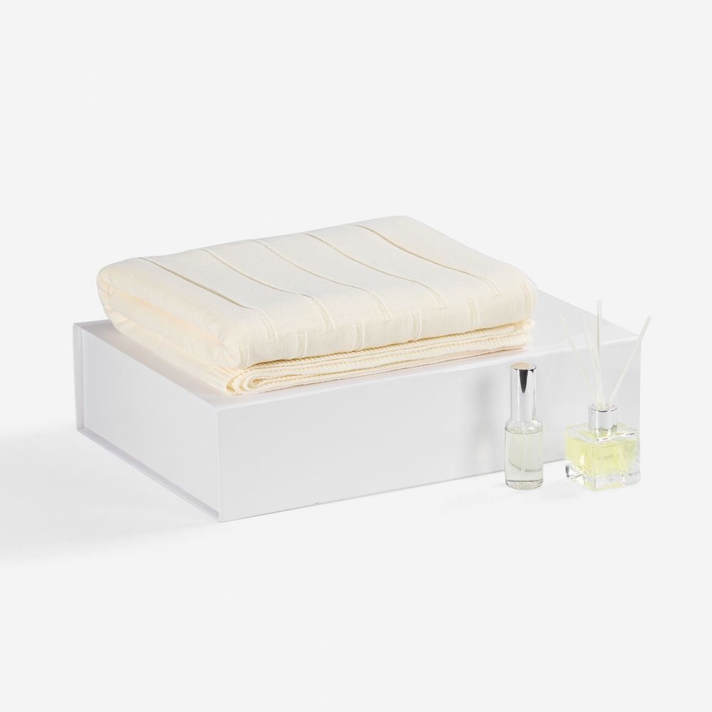 | Материал | плед - акрил 100%, плотность 310 г/м² ; флакон - стекло, палочки из файбера; коробка - переплетный картон, бумага Majestic |