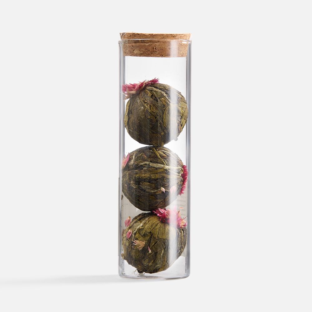 • связанный зеленый чай с цветами «Нефритовый Лотос» (состав: зеленый чай сенча, цветы хризантемы), вес 25 г — благодаря особой технологии скрутки чай, словно цветок, распускается в чайнике или чашке, при заваривании рекомендуем использовать прозрачную стеклянную посуду;