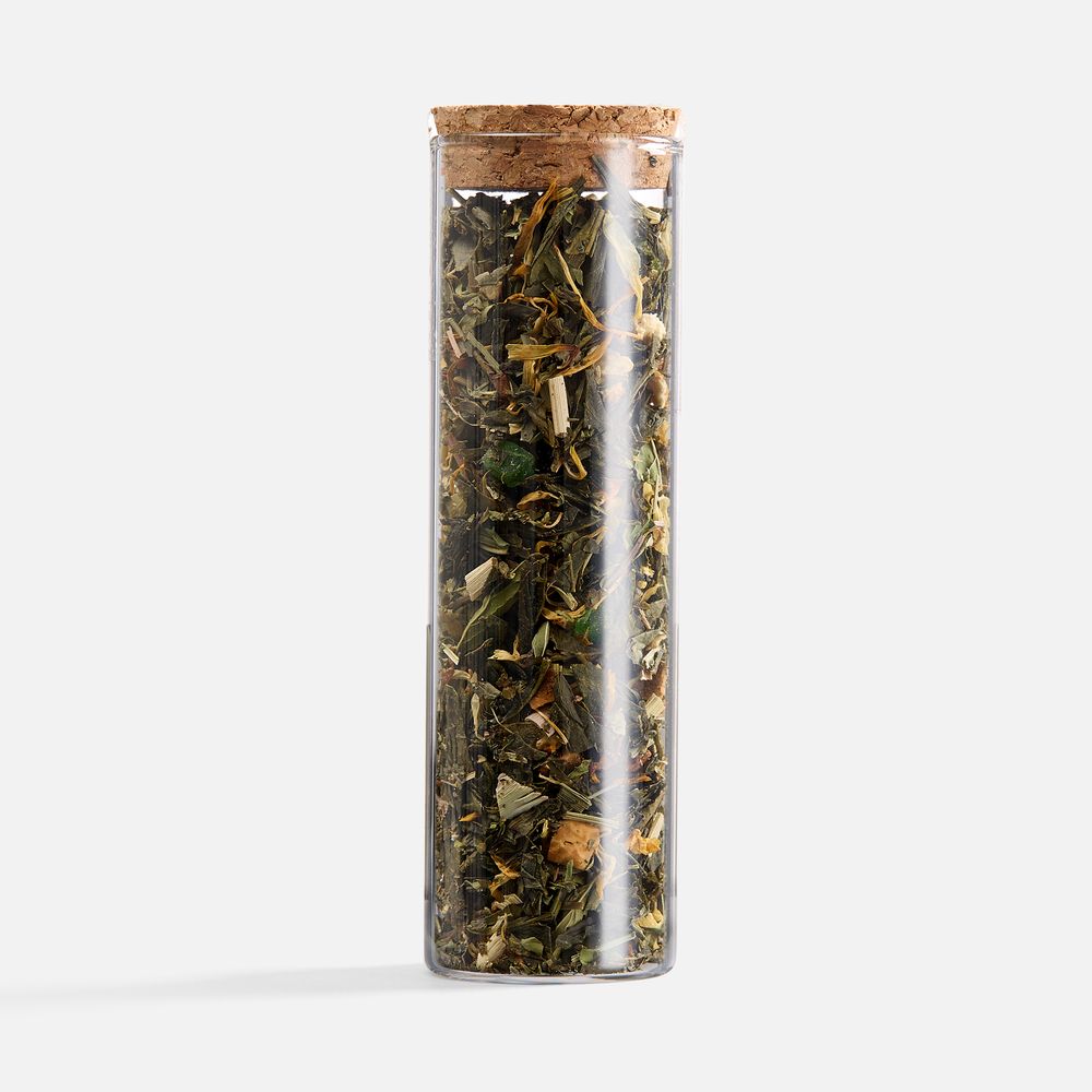 • чай зеленый ароматизированный «Хорошее настроение» (состав: зеленый чай сенча, лимонная трава, календула, мята, сушеное яблоко, сушеный апельсин, сушеная клубника, ароматизатор «лайм», ароматизатор «мята»), вес 25 г.