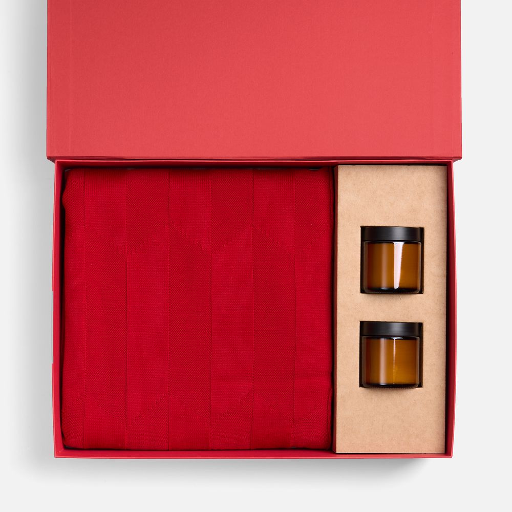 Материал плед - акрил 100%, плотность 286 г/м²; подсвечник - стекло, крышка - пластик; свеча - парафин, соевый воск, парфюмерная композиция; коробка - переплетный картон, бумага Сurious