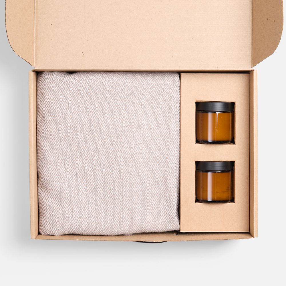 Мягкий плед с нежной бахромой станет идеальным спутником для расслабляющих вечеров, создавая комфорт и стильный облик в любом интерьере. Две ароматические свечи в элегантных стеклянных баночках наполнят пространство расслабляющим мягким светом и тонким ароматом, добавляя нотки спокойствия и гармонии.