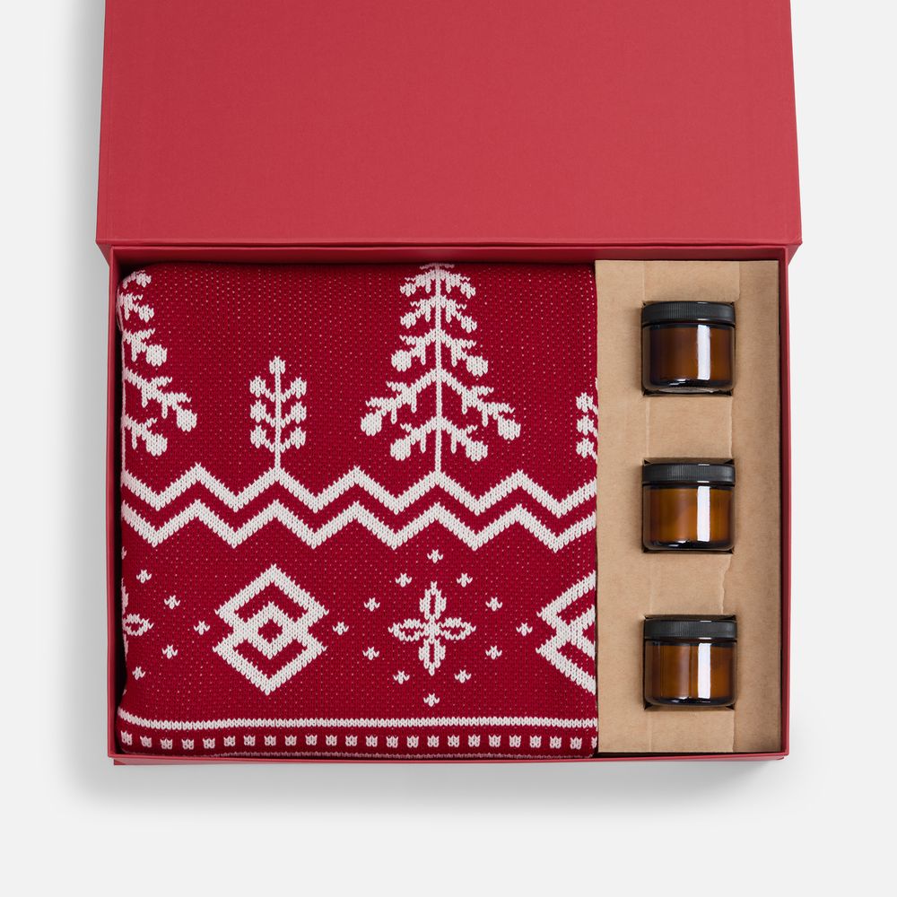 Идеальный зимний подарок для ваших партнёров и клиентов. Этот набор — дань уютным традициям и современному стилю. Мягкий плед с аутентичными зимними узорами и три изысканных аромасвечи дарят атмосферу тепла, праздника и беззаботности.