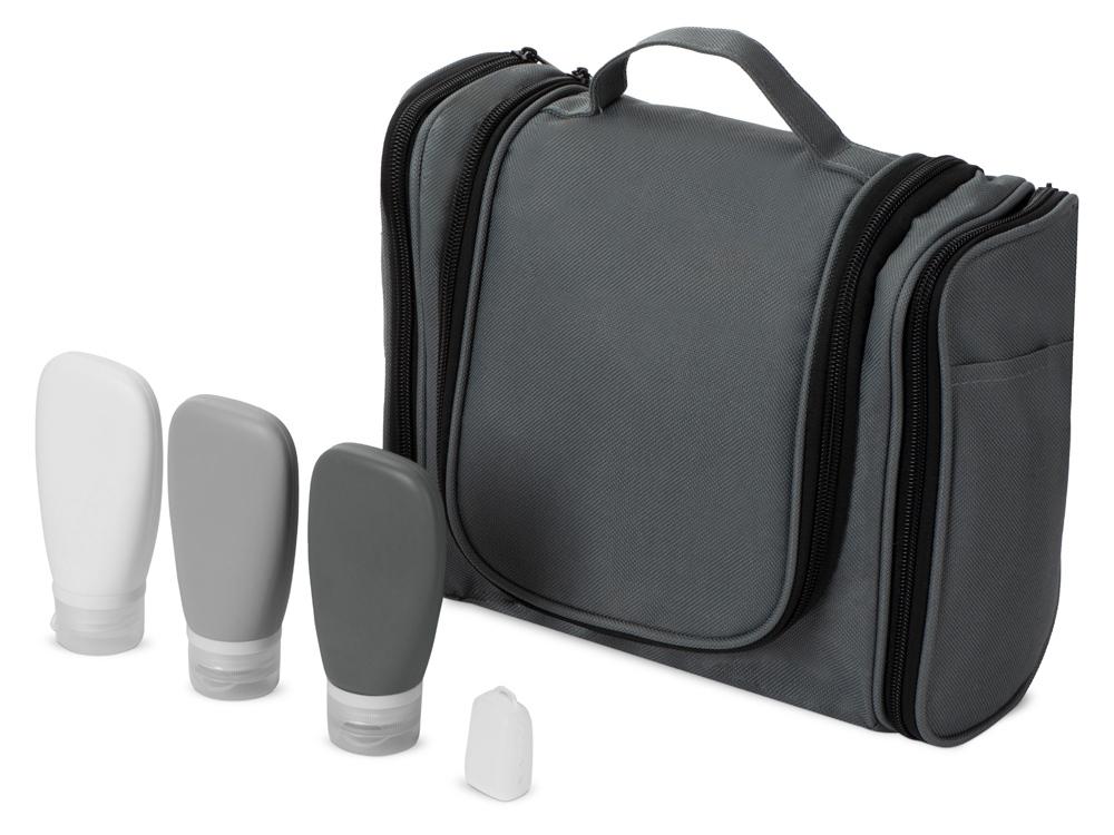 Набор On air состоит из двух предметов: Несессер для путешествий. Эргономичный и вместительный, имеет внутренние и внешние карманы и большое отделение внутри. Оснащён ручкой для переноски и крючком для подвешивания. Нейтральный лаконичный дизайн позволяет преподнести несессер как мужчине, так и женщине; Силиконовые ёмкости для косметических средств. Три флакончика по 90 мл каждый пригодятся для коротких поездок, а еще они вписываются в лимит большинства авиакомпаний по провозу жидкости в ручной клади. - силиконовые флакончики упакованы в полупрозрачную косметичку из EVA; - колпачок для зубной щётки в комплекте; - в несессере предусмотрены резинки и кармашки для мелких предметов, например, бритвенного станка.