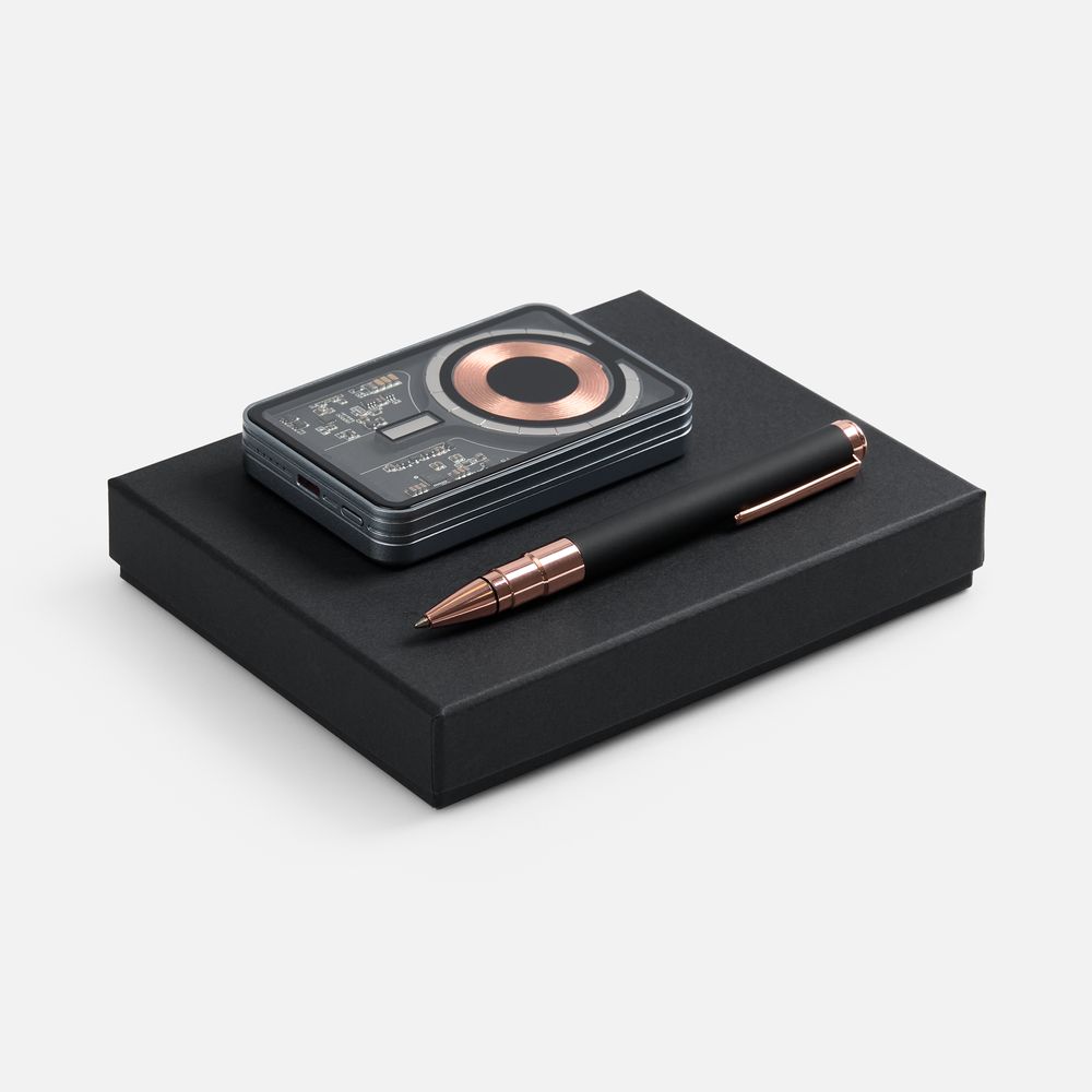 Компактный аккумулятор Cooper Ergo с премиальным корпусом и привлекательной электронной «начинкой» под прозрачной панелью в сочетании с увесистой шариковой ручкой Kugel Rosegold станут идеальным подарком как для коллег, так и для руководителей.