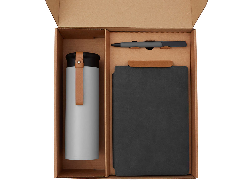 Функциональный и сбалансированный набор для сотрудников, партнёров или клиентов — отлично подойдёт для welcome-боксов, тимбилдингов, внутренних мероприятий и корпоративных праздников. Состав набора: • Блокнот — удобный формат для записей, брифов и ежедневных задач • Ручка — классическая, с необычным слайдером и приятной soft-touch поверхностью делает письмо более комфортным. • Термос из долговечной нержавеющей стали с двойными стенками, вакуумная изоляция между которыми помогает сохранять температуру напитков в течение долгого времени. Термос идеально подходит для заваривания чая: специально для этого в комплекте идет металлическое ситечко с ручкой, которое не пропустит ни одной чаинки. • Классический чёрный байховый чай поможет взбодриться и освежить мысли, поэтому его можно пить утром для лёгкого пробуждения или днём — чтобы восстановить силы и сосредоточиться. Вечером он станет приятным завершением дня в сочетании с десертом или лёгкими закусками. • Набор стикеров — для ярких акцентов и персонализации вещей; • Универсальный ложемент обеспечивает аккуратное размещение и надёжную фиксацию элементов, делая набор эффектным и презентабельным при вручении. • Дополнительное преимущество — набор доступен в конструкторе наборов: компоненты можно заменить и собрать индивидуальный вариант под стиль компании или вкусы получателя. • Готовое решение для корпоративных подарков • Все элементы функциональны и актуальны для повседневного использования