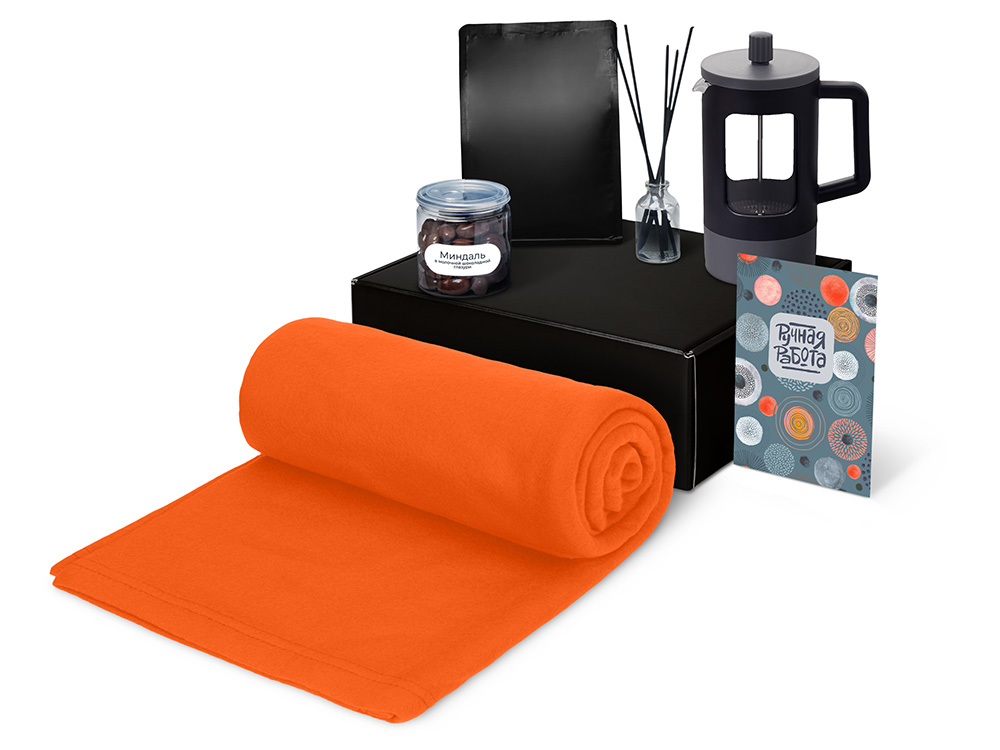 Материал товара плед - флис, полиэстер, кофе - пластик, френч-пресс - нержавеющая сталь, боросиликатное стекло, ПП пластик, диффузор - стекло, миндаль - пластик, мешок - нетканый материал (спанбонд), коробка - картон