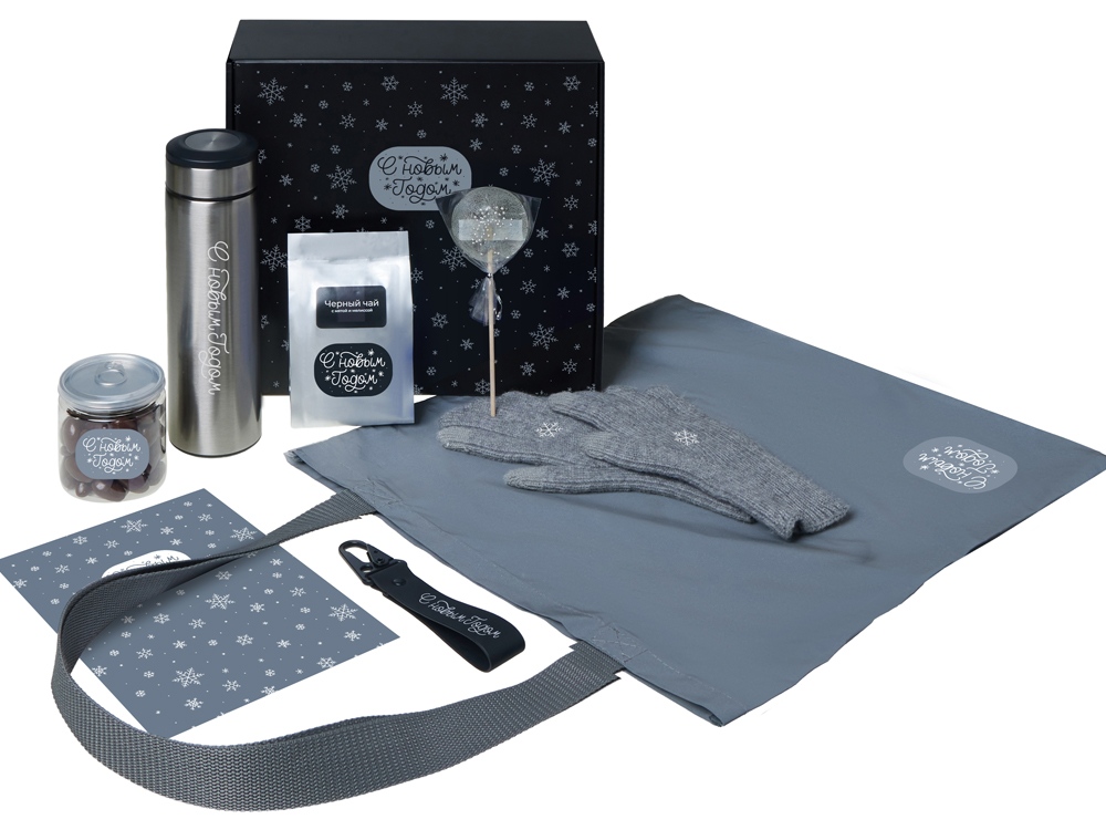 Подарочный набор с перчатками, термосом и чаем, серый