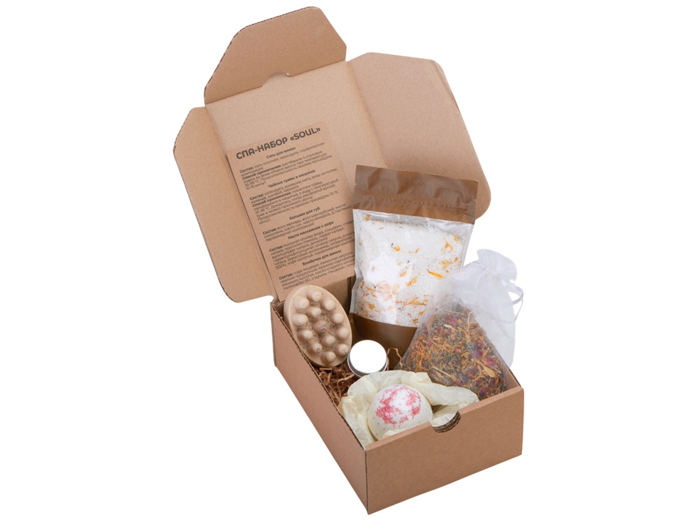 Подарите себе роскошный спа-уход прямо у себя дома с набором для тела Soul, созданным исключительно из натуральных ингредиентов! В этом наборе вы найдете все необходимое для расслабления, очищения и питания вашей кожи, чтобы она выглядела здоровой и сияющей. В набор входят: - Соль для ванны: натуральная морская соль, смешанная с календулой обогащена минералами, она поможет снять напряжение и усталость, расслабить мышцы и улучшить кровообращение. Соль также способствует выведению токсинов из организма и укреплению иммунной системы. - Бомбочка для ванны: Насладитесь волшебным моментом, когда ароматная бомбочка растворится в вашей ванне, превратив ее в настоящее произведение искусства. Она наполнит вашу ванну приятным ароматом ромашки и подарит вашей коже мягкость и увлажнение. - Травяной сбор для ванны: Уникальный сбор из целебных трав, таких как календула, ромашка, лаванда и мята, поможет успокоить кожу, снять раздражение и воспаление, а также улучшить ее общее состояние. - Бальзам для губ: Нежный бальзам для губ, созданный на основе натуральных масел и восков, обеспечат вашим губам интенсивное увлажнение и защиту от обветривания и сухости. В составе масло ши, масло кокосовое, масло миндаля, воск авокадо, Д пантенол и парфюмерная композиция. - Кофейное мыло-скраб: Данный продукт мягко и нежно отшелушит вашу кожу, удалив омертвевшие клетки и стимулировав кровообращение. Кофеин, содержащийся в кофе, поможет уменьшить целлюлит и придать вашей коже тонус и упругость. Все компоненты набора Soul имеют натуральный состав и не содержат вредных химических веществ. Срок годности набора составляет 24 месяца, что гарантирует его длительное использование. Позвольте себе насладиться минутами блаженства и ухода за своим телом! Спа-набор Soul станет отличным подарком для вас или ваших близких, которые ценят натуральность и качество. Состав: - Соль для ванны: соль морская, календула, парфюмерная композиция. 300 г. - Чайные травы в мешочке: календула, ромашка, мята, роза, лаванда. 25 г. - Бальзам для губ: масло ши, масло кокосовое, масло миндаля, воск авокадо, Д пантенол, парфюмерная композиция. - Мыло массажное с кофе: мыльная основа (Вода, глицерин, стеарат натрия, пропилен гликоль, лаурат натрия, ауретсульфат натрия, динатрия лауретсульфосукцинат, хлорид натрия, диоксид титана, акриловый сопилимер, тетранатрия ЭДТА), кофе молотый, парфюмерная композиция. - Бомбочка для ванны: сода пищевая, лимонная кислота, крахмал кукурузный, крахмал картофельный, масло сладкого миндаля, полисорбат-80, отдушка, глицерин, краситель.