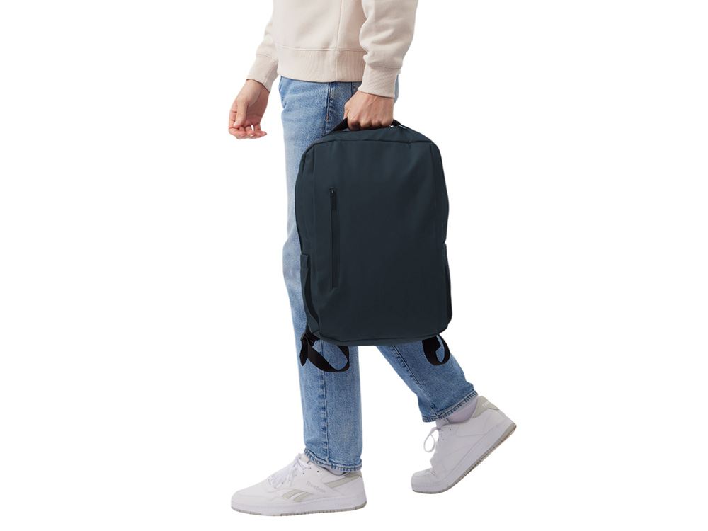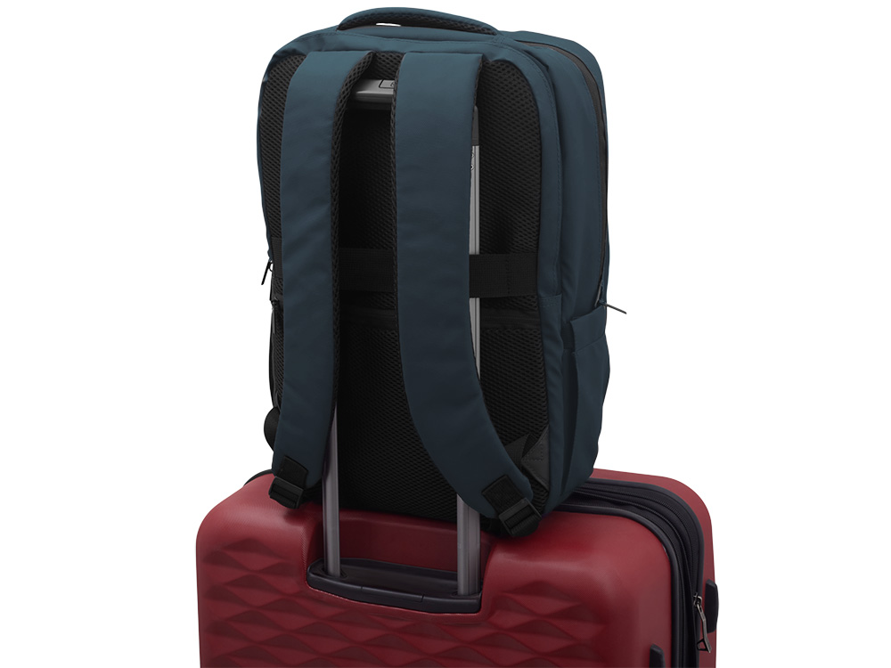 Непромокаемый бизнес рюкзак с двумя вместительными отделениями и карманом на молнии спереди. В одном отделении расположены карман для ноутбука и планшета, в другом органайзер и много пространства для одежды и других вещей на случай деловой поездки. На сетчатой спинке расположен потайной кармана на молнии для документов и личных вещей и ремень для крепления на ручку чемодана. Сверху удобная мягкая ручка для переноски. Лямки регулируются по длине.